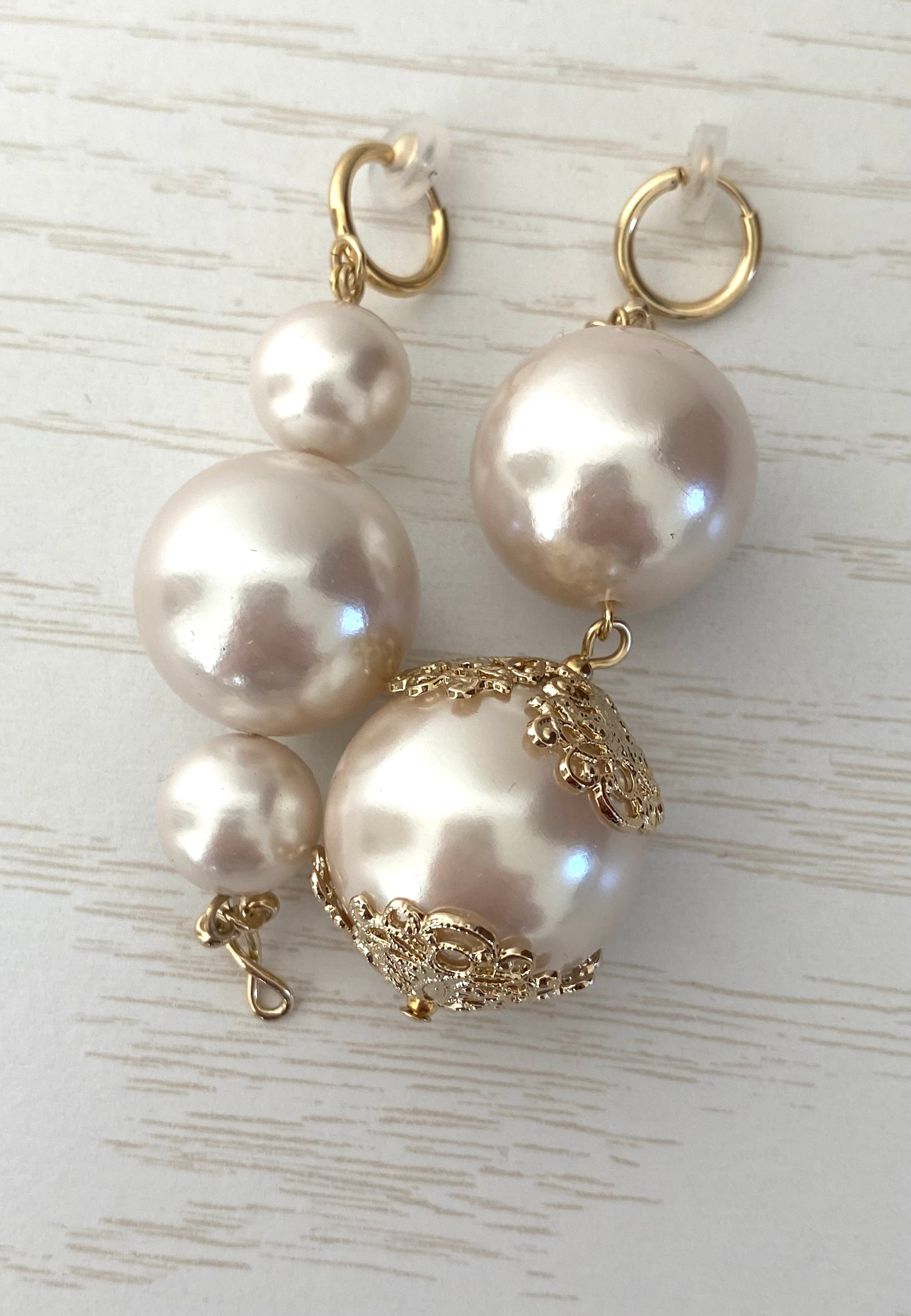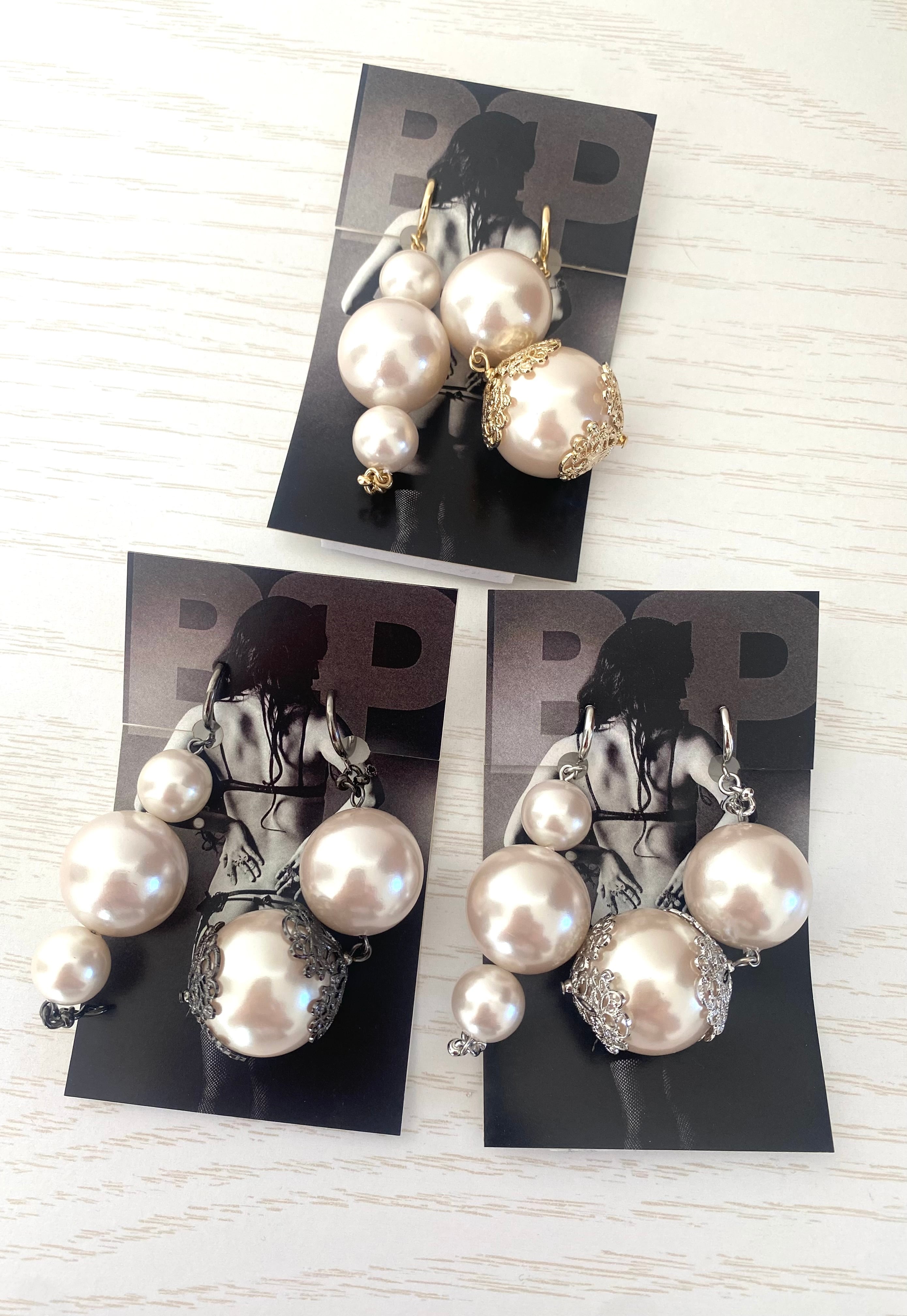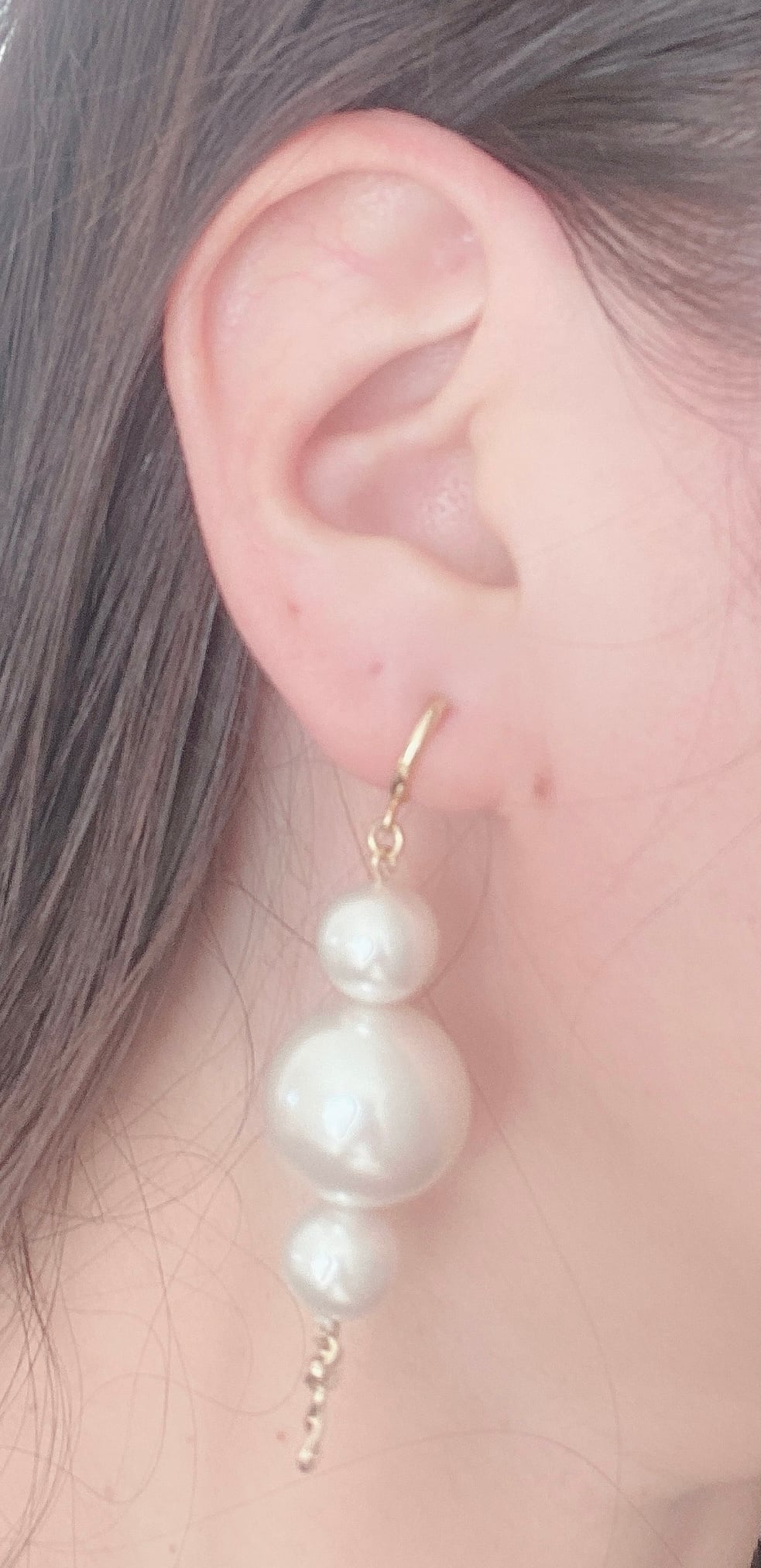 最大22mmの大粒パールを使用したボリュームある豪華なアシンメトリーイヤリングです。