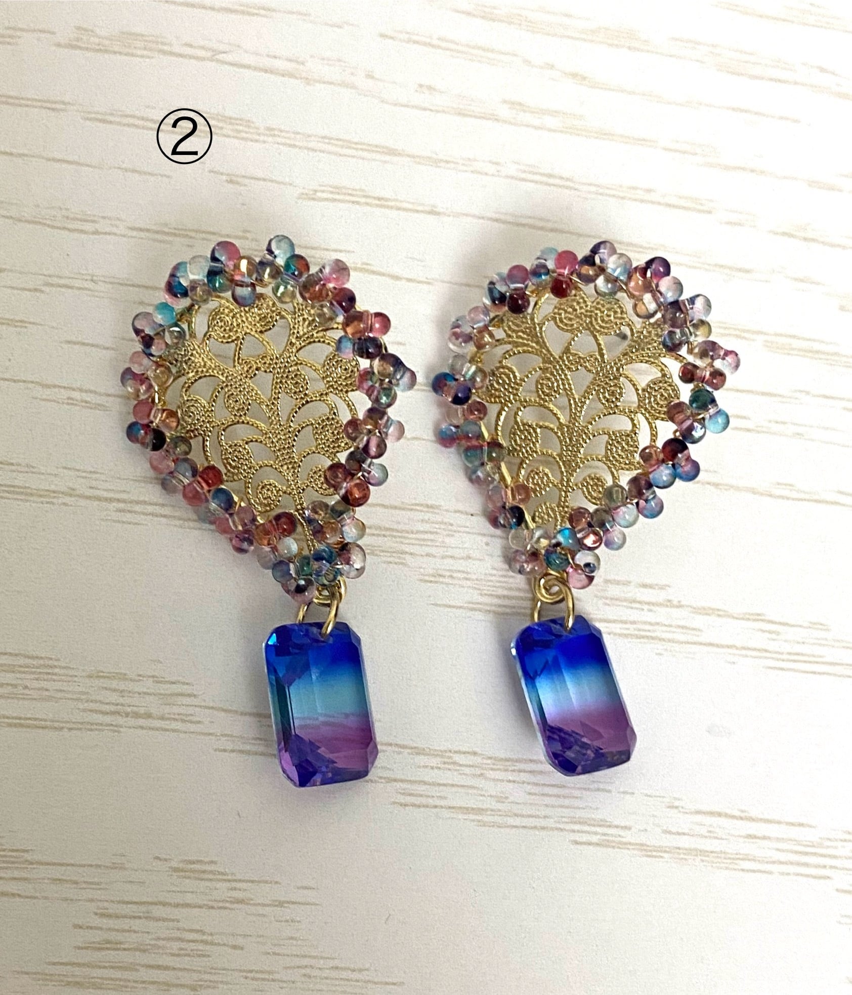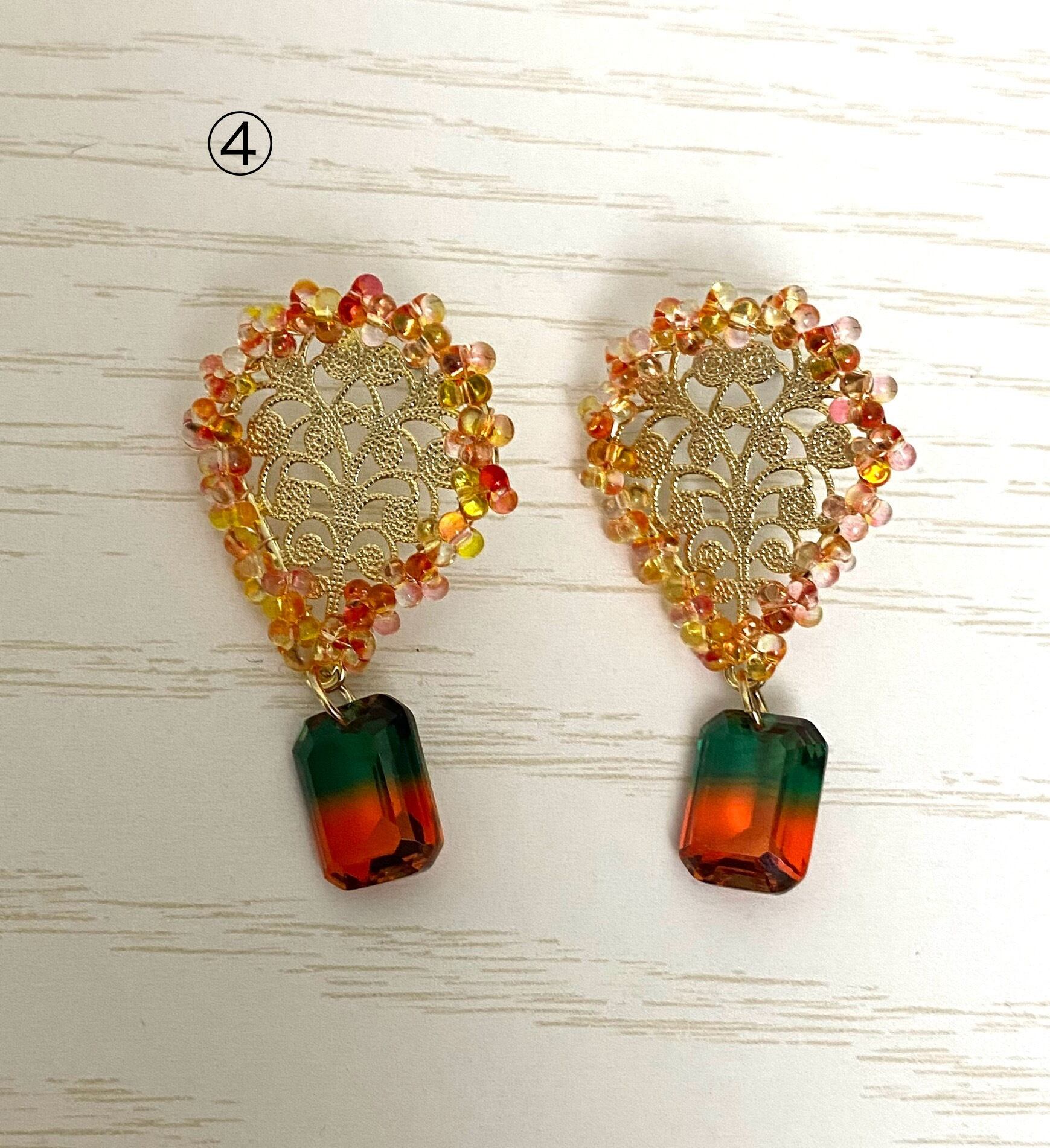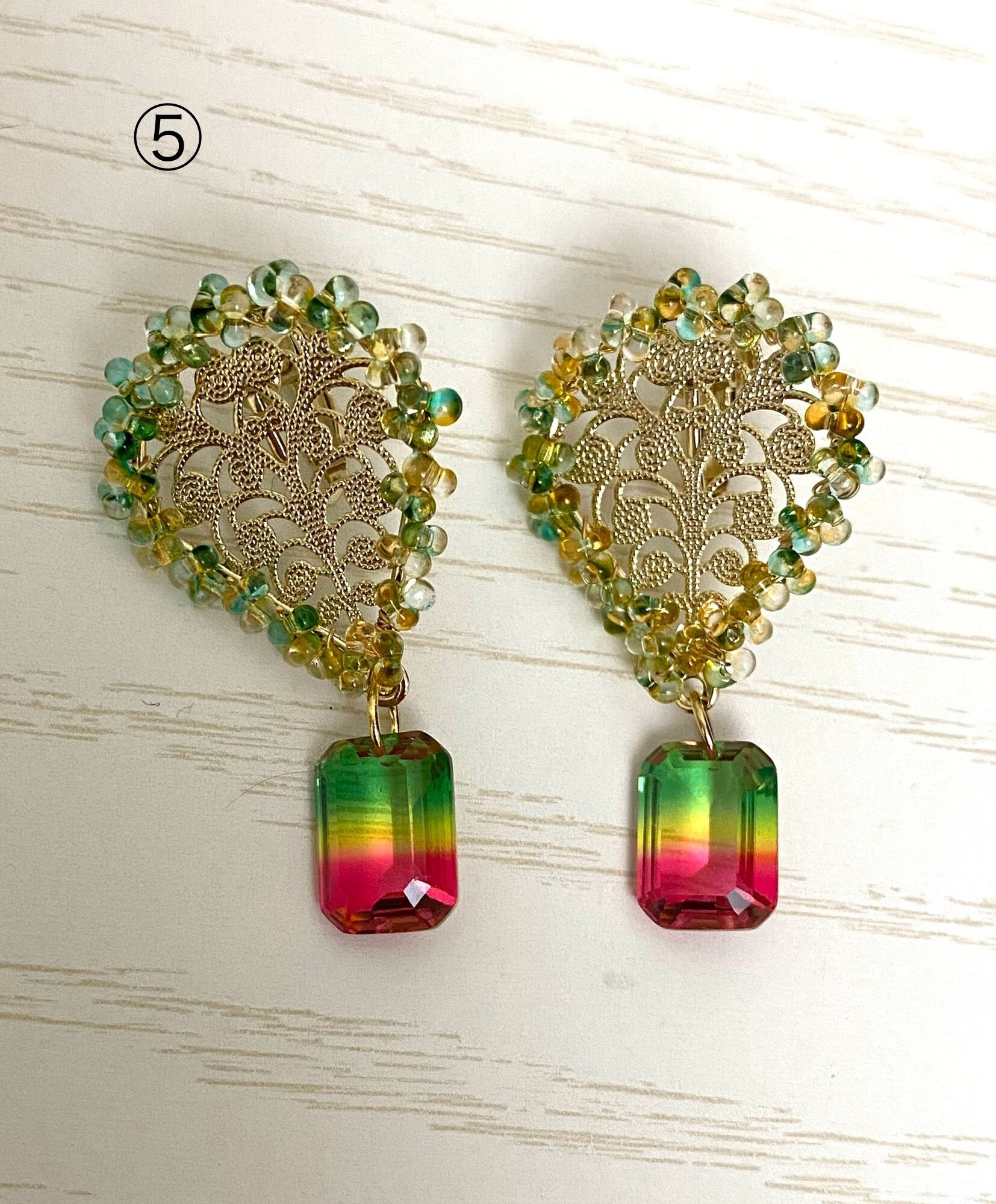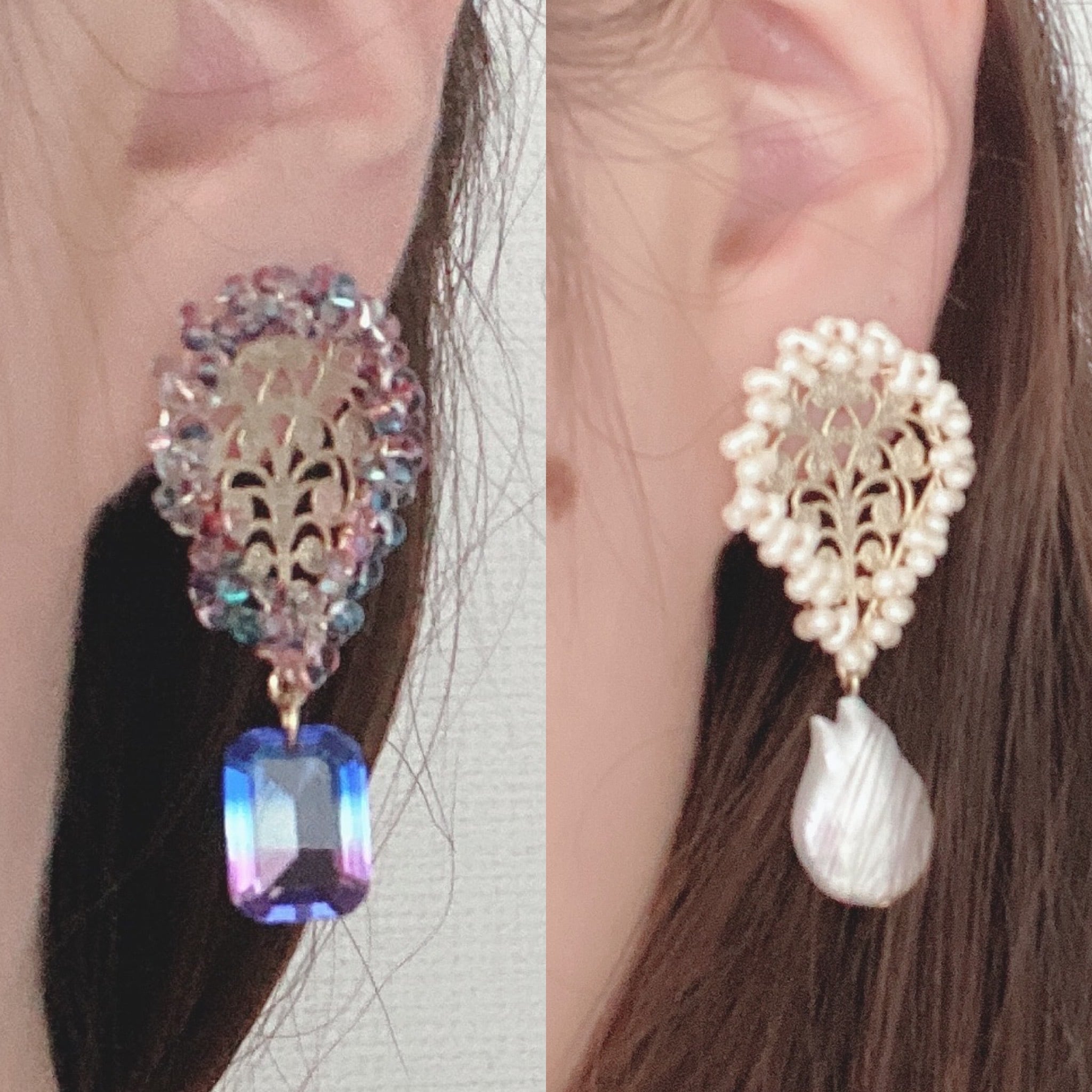 アラベスク模様に淡水パールを下げたピアスとグラデーションガラスを下げたピアスです。