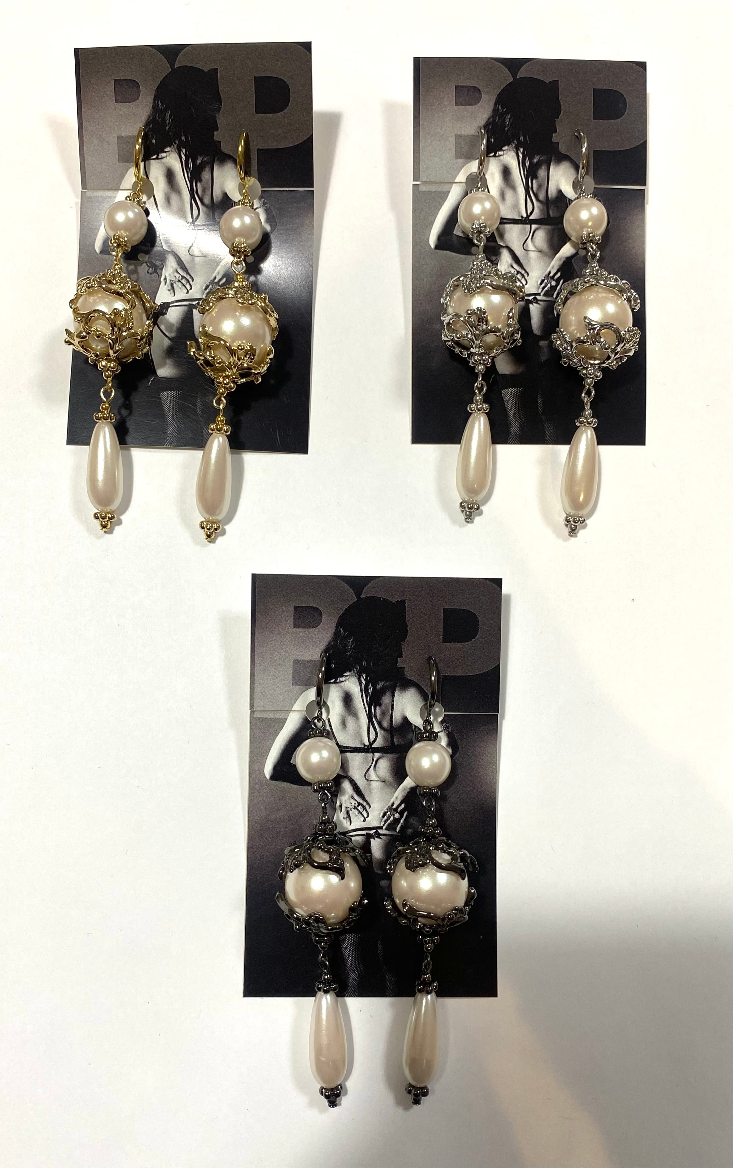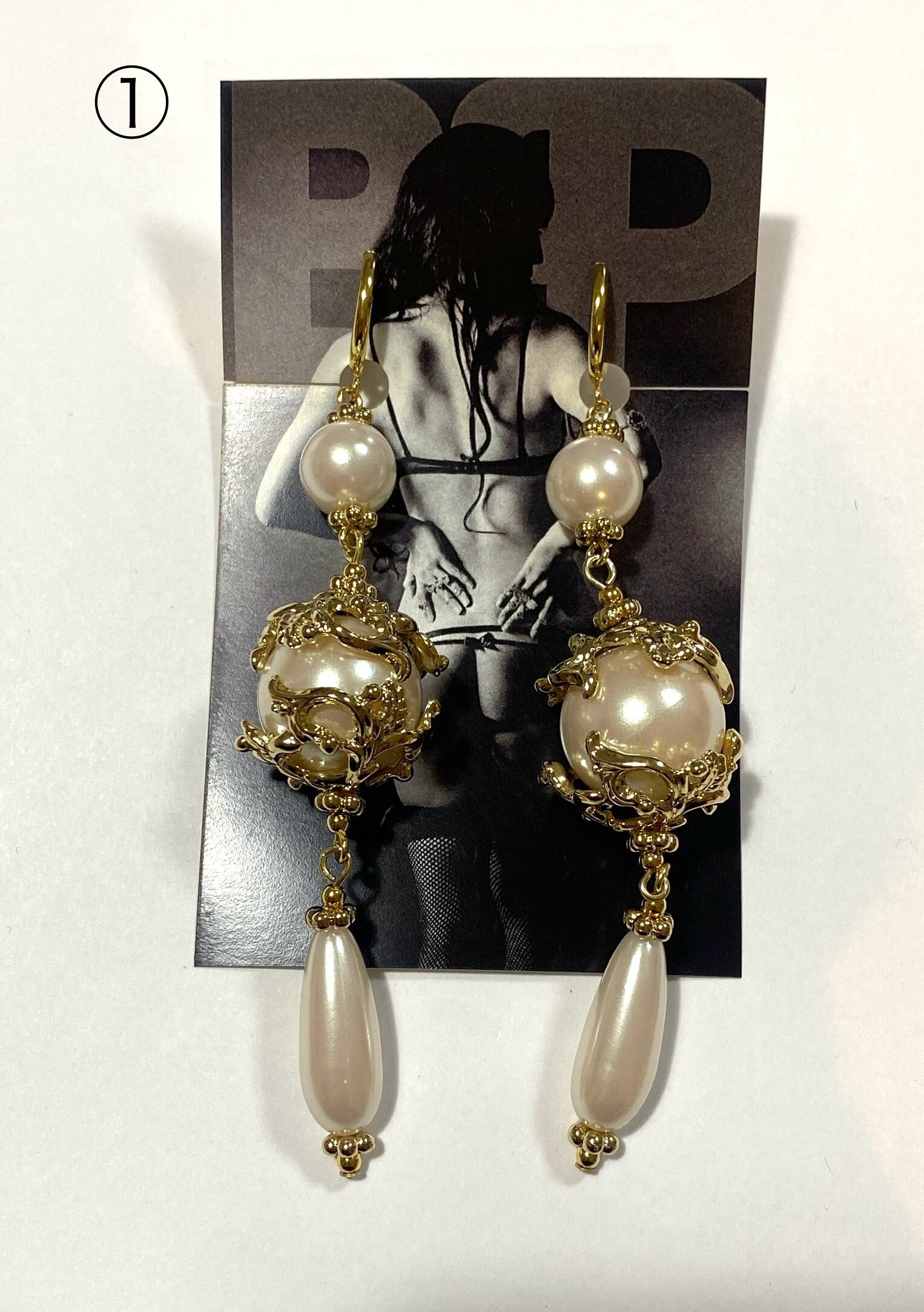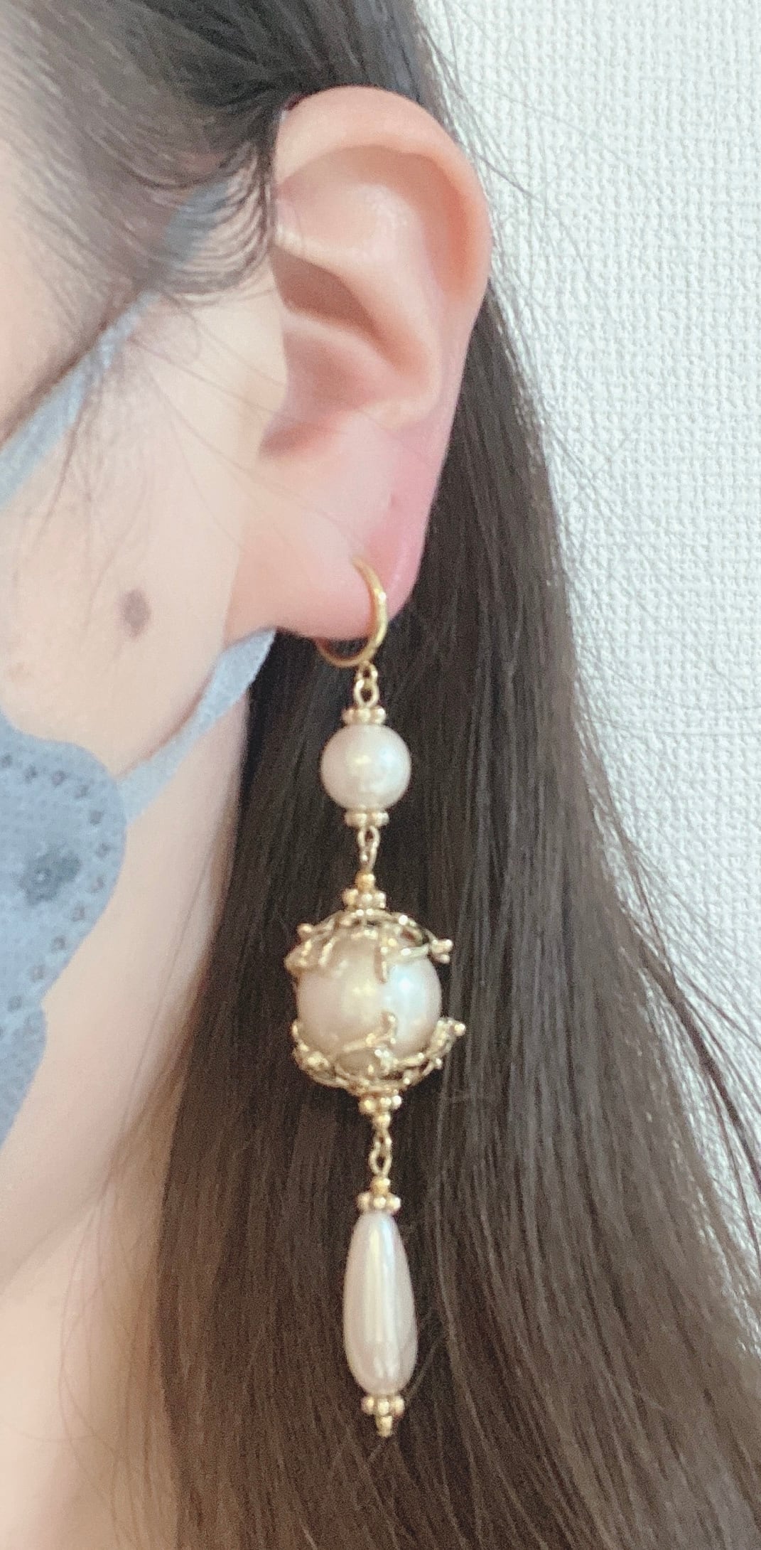 ボリュームあるメタルキャップにドロップパールを下げたピアスです。