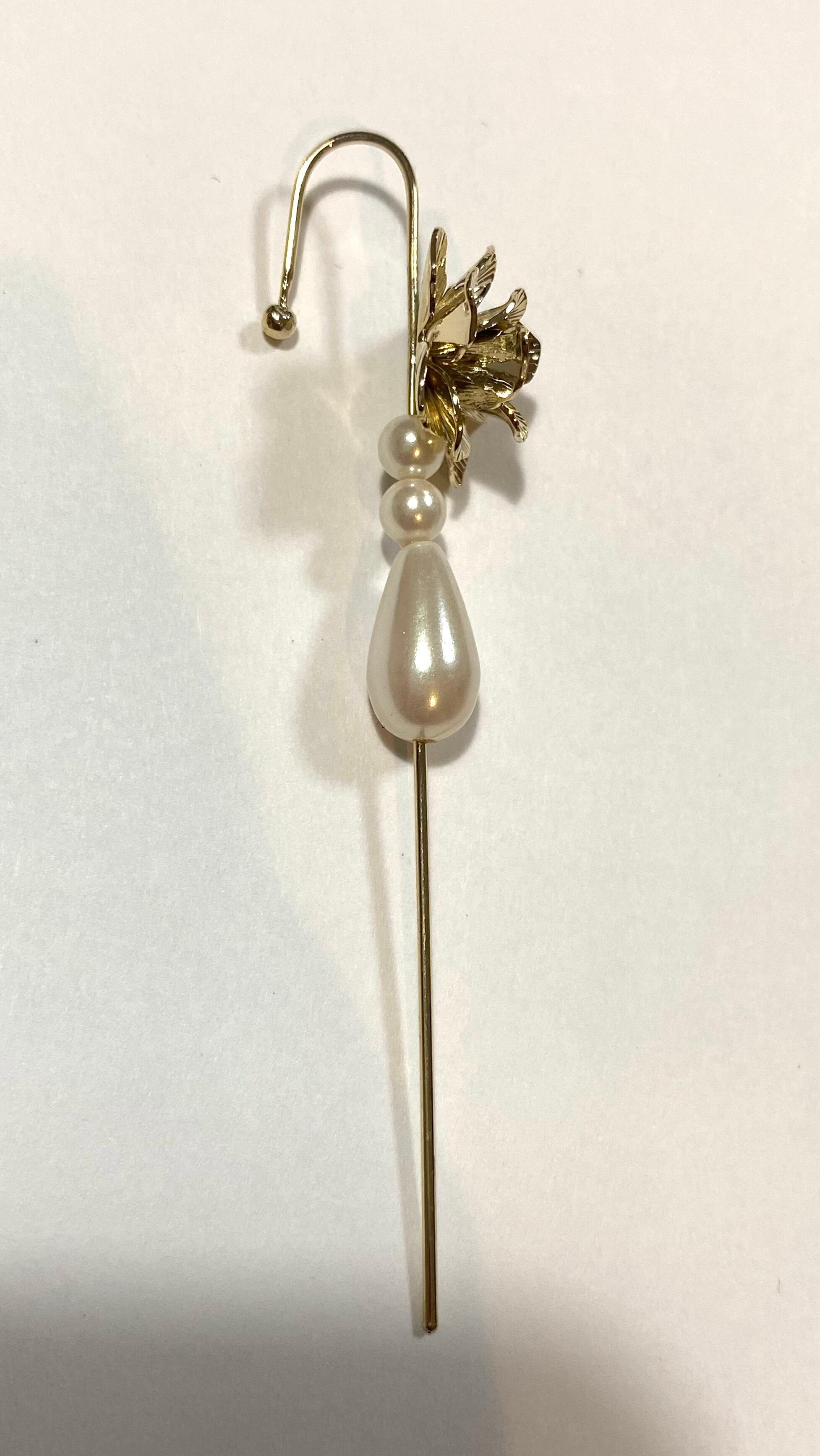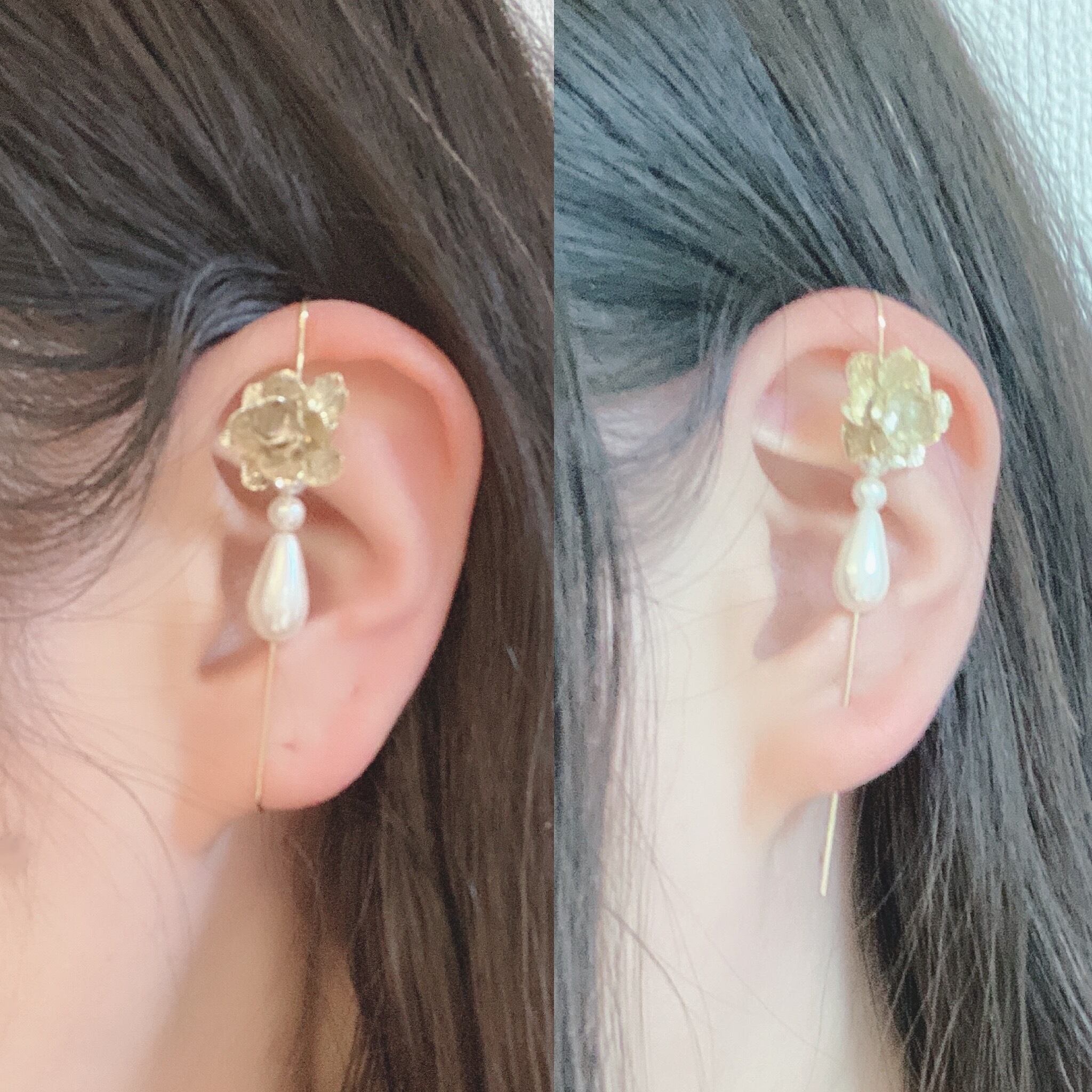 画像のようにピアスの穴に先端を刺してからフック部分を耳に引っ掛けて使用します。