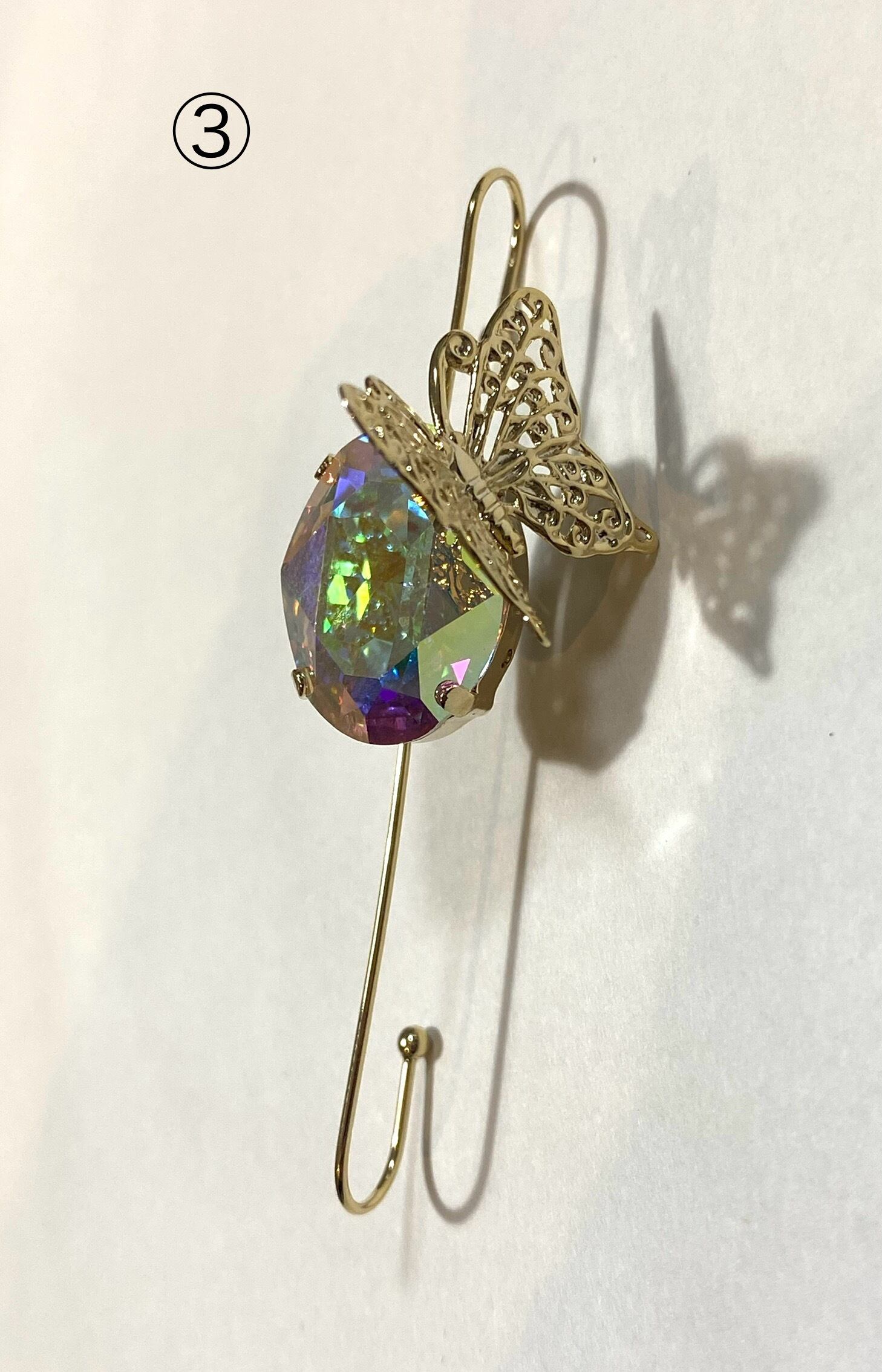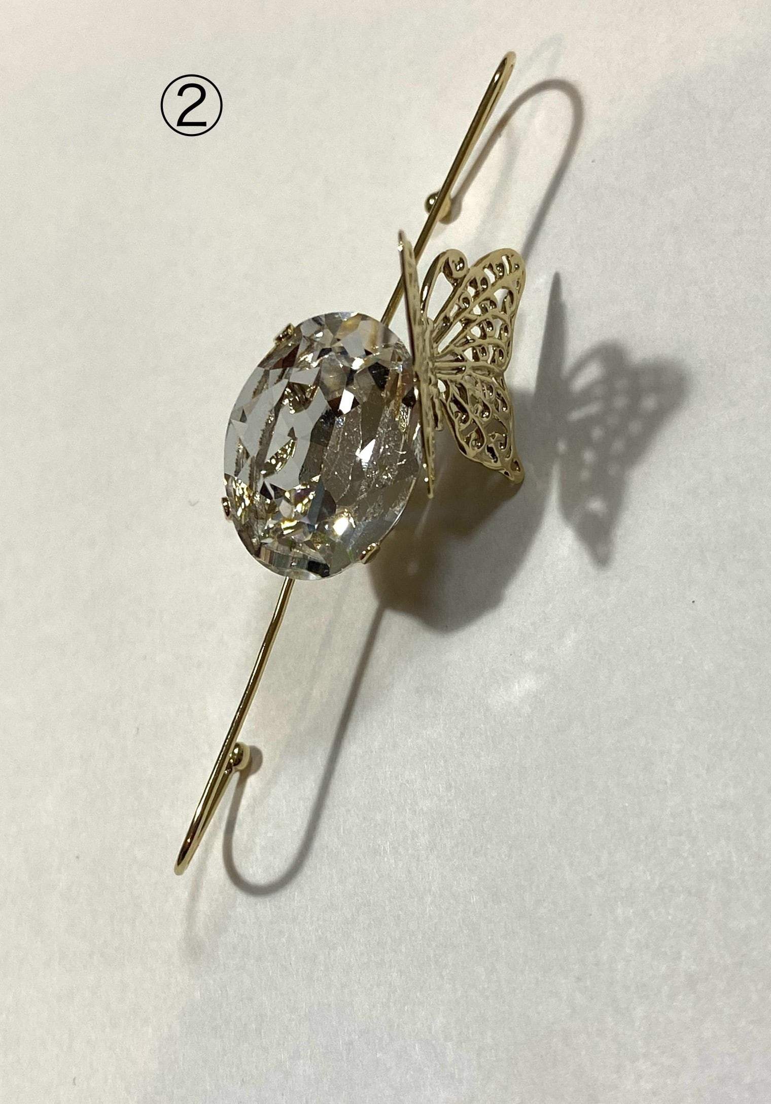 大振りの蝶々と18×13のガラスやパールを使用したスティックイヤカフです。