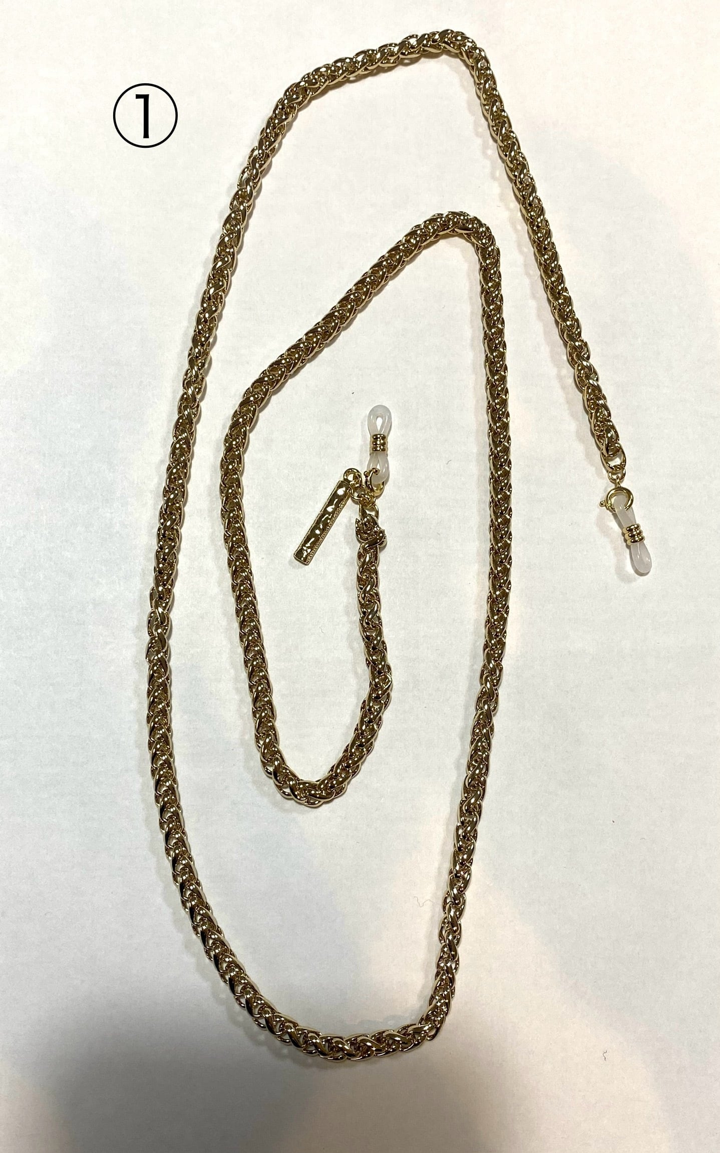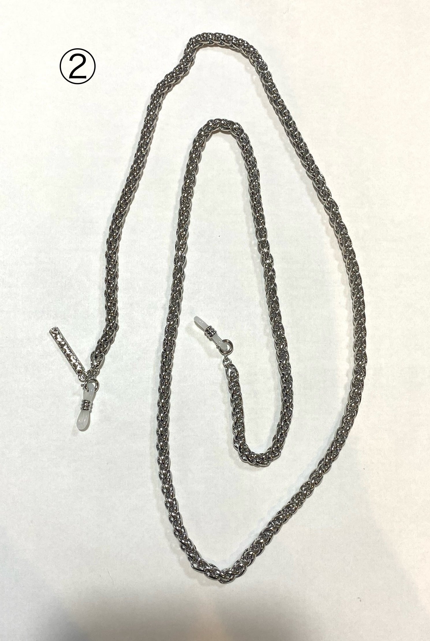 着用画像が大きめのチェーンが気にならない位置の目安になります。お客様の好みで眼鏡に付ける位置を調整していただければ幸いです。