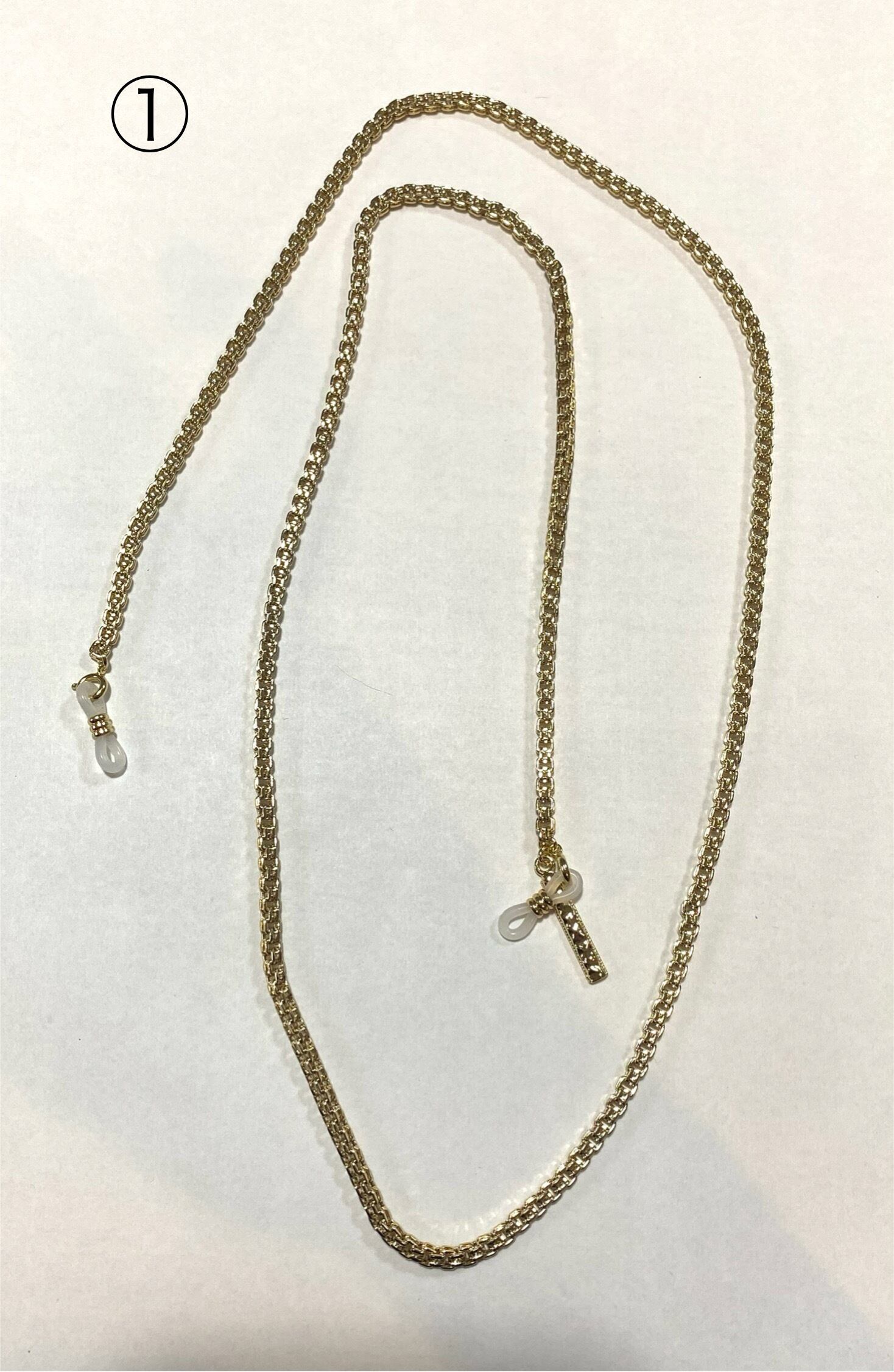 着用画像が大きめのチェーンが気にならない位置の目安になります。お客様の好みで眼鏡に付ける位置を調整していただければ幸いです。