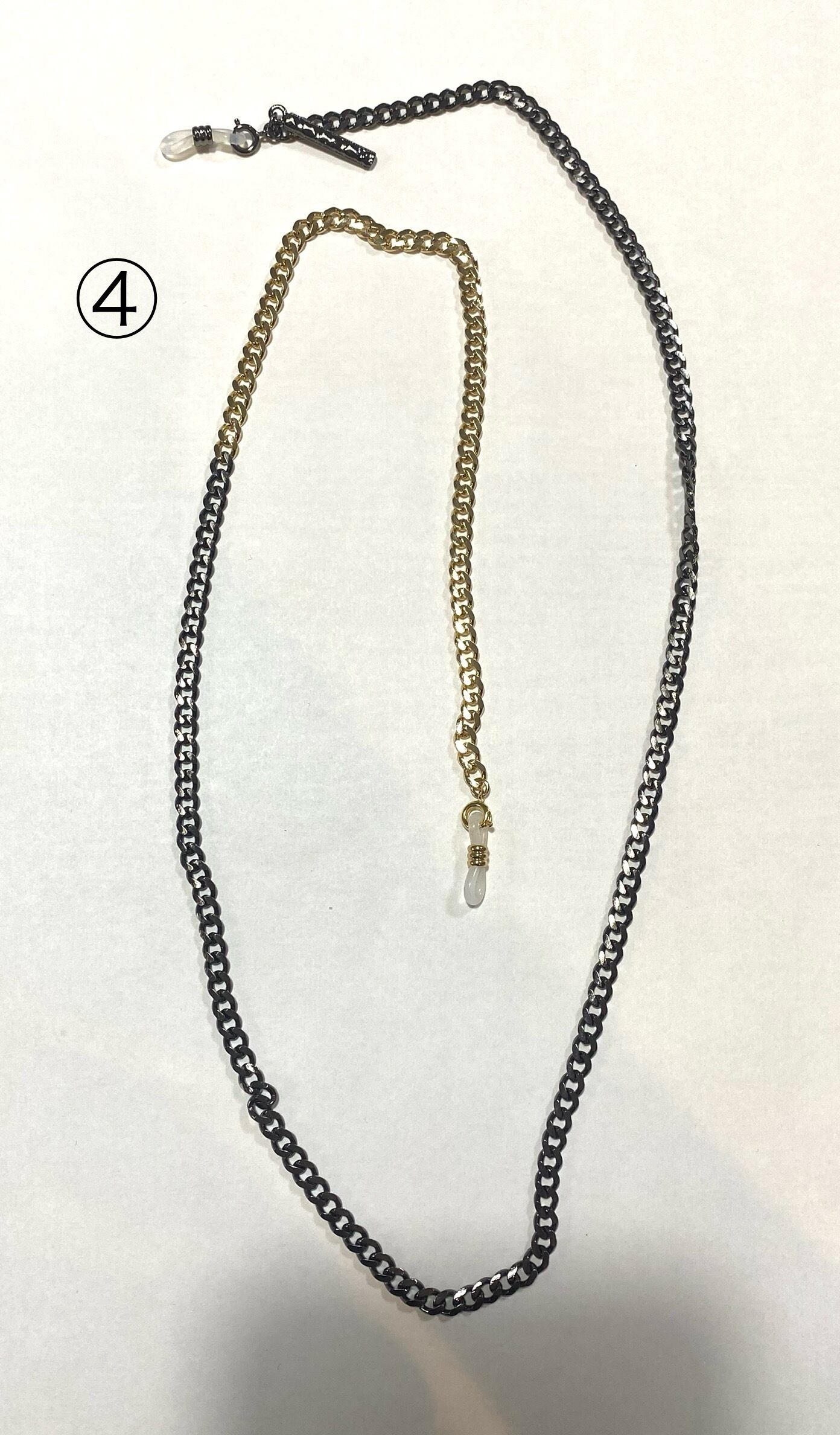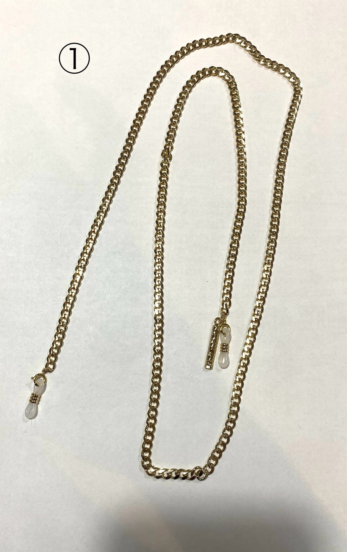 着用画像が大きめのチェーンが気にならない位置の目安になります。お客様の好みで眼鏡に付ける位置を調整していただければ幸いです。