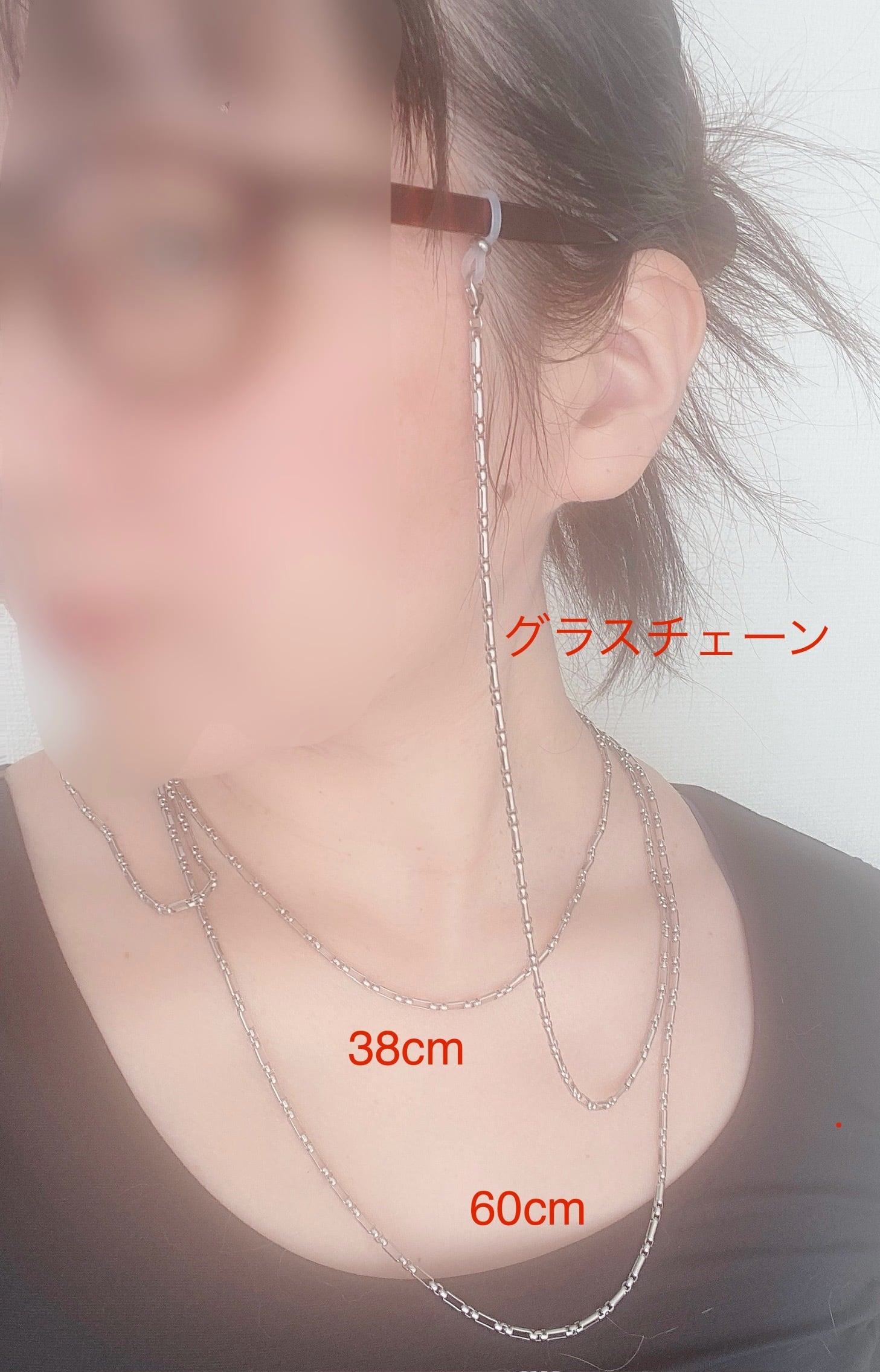 着用画像が大きめのチェーンが気にならない位置の目安になります。お客様の好みで眼鏡に付ける位置を調整していただければ幸いです。