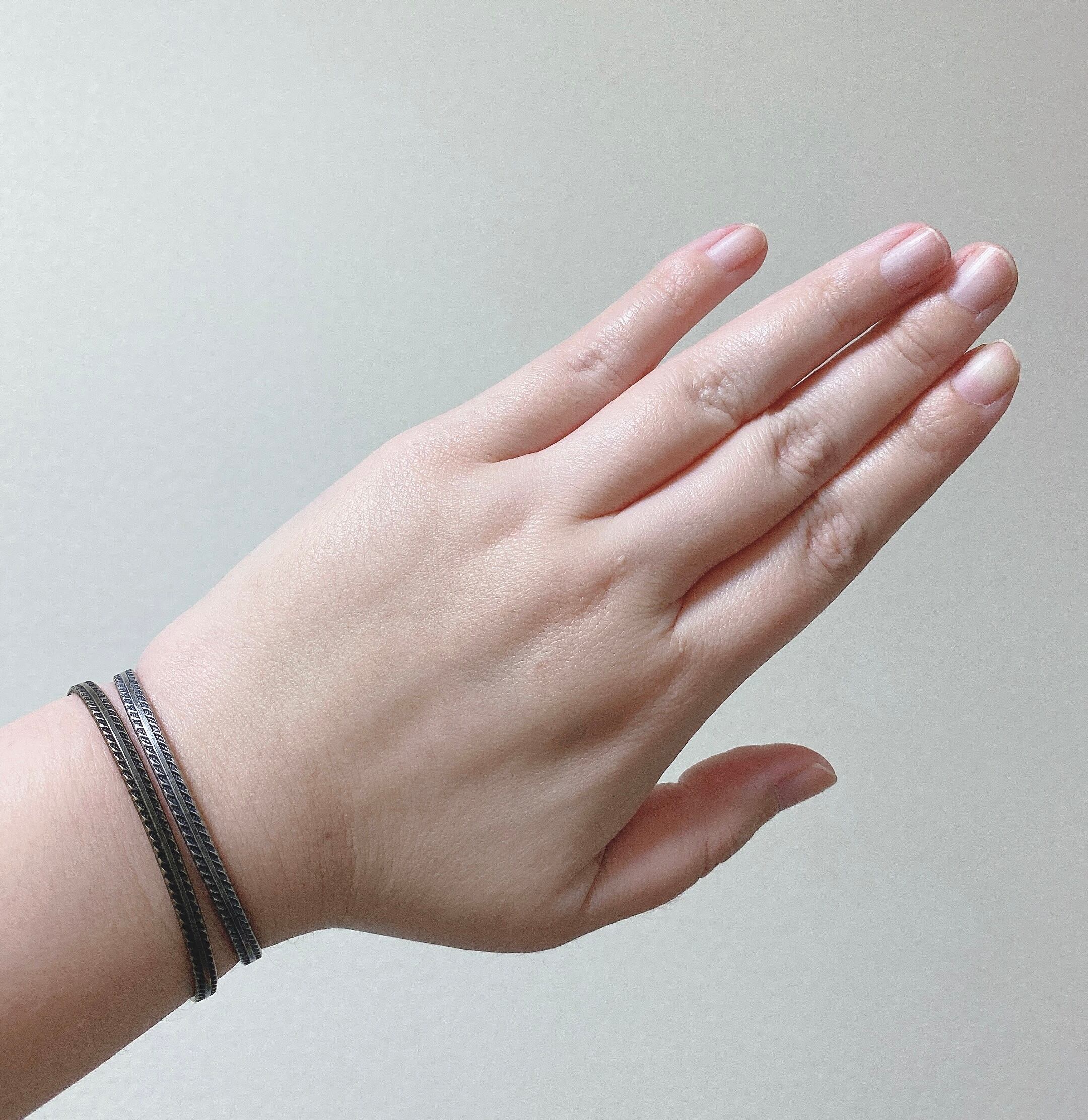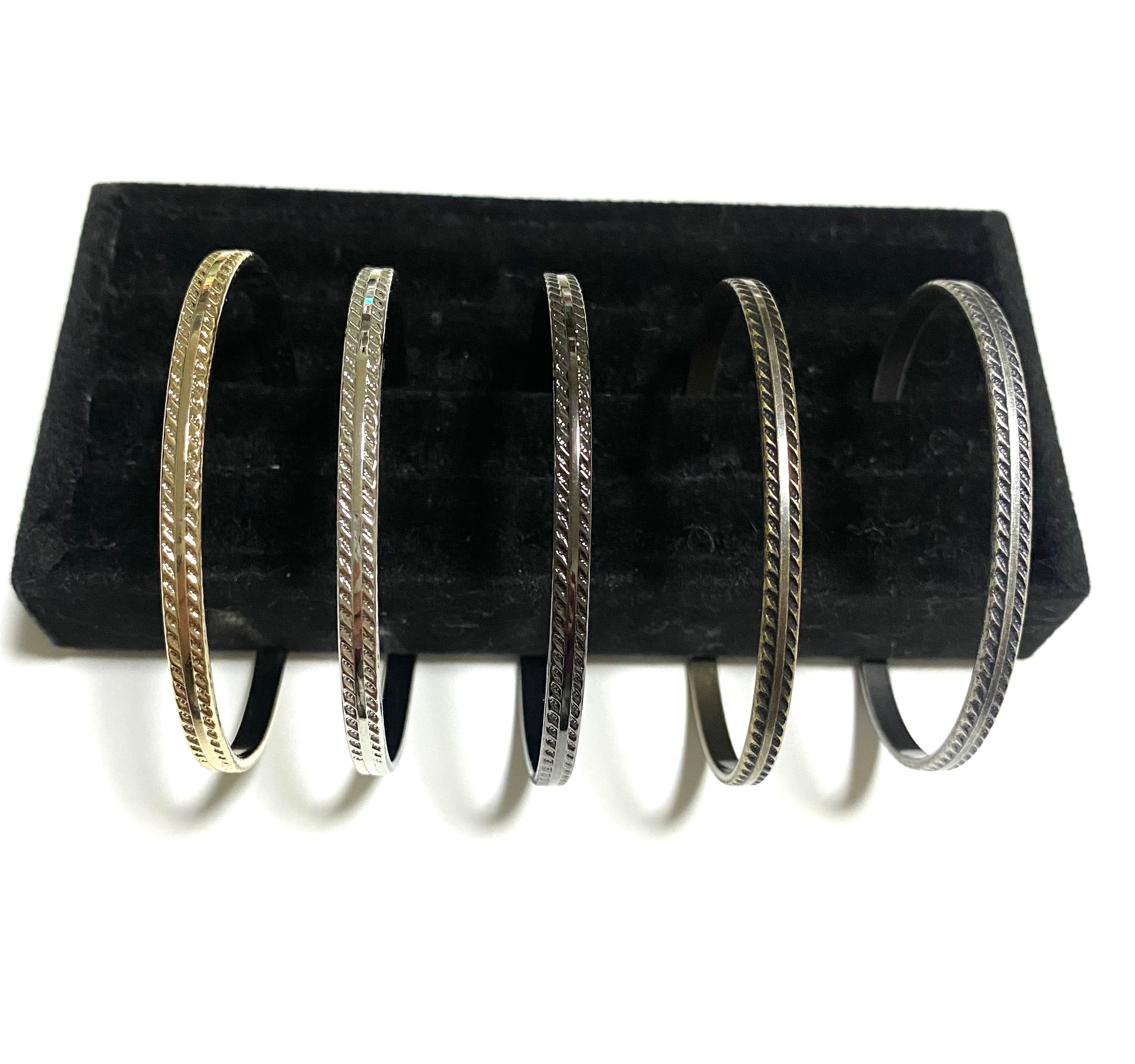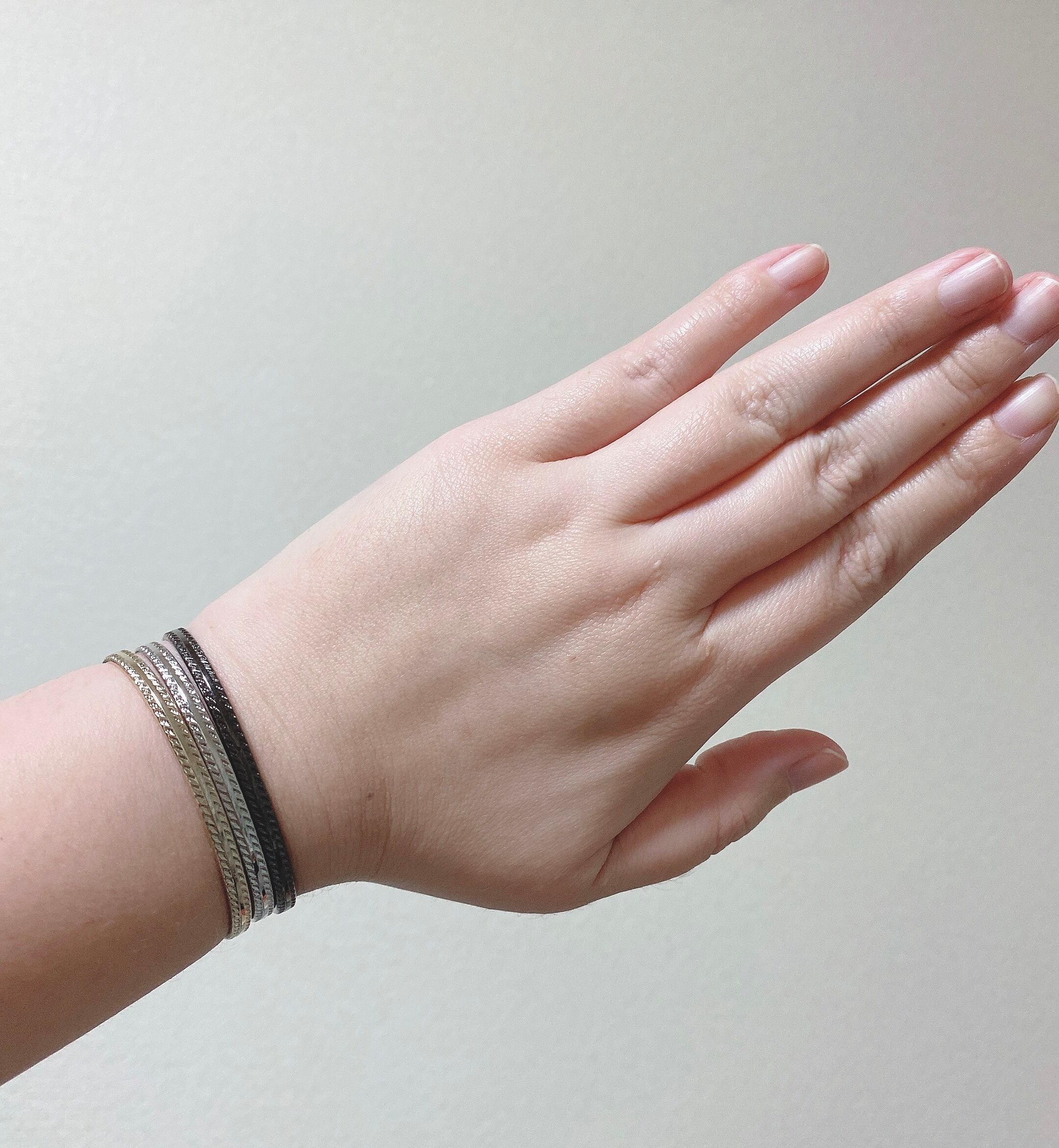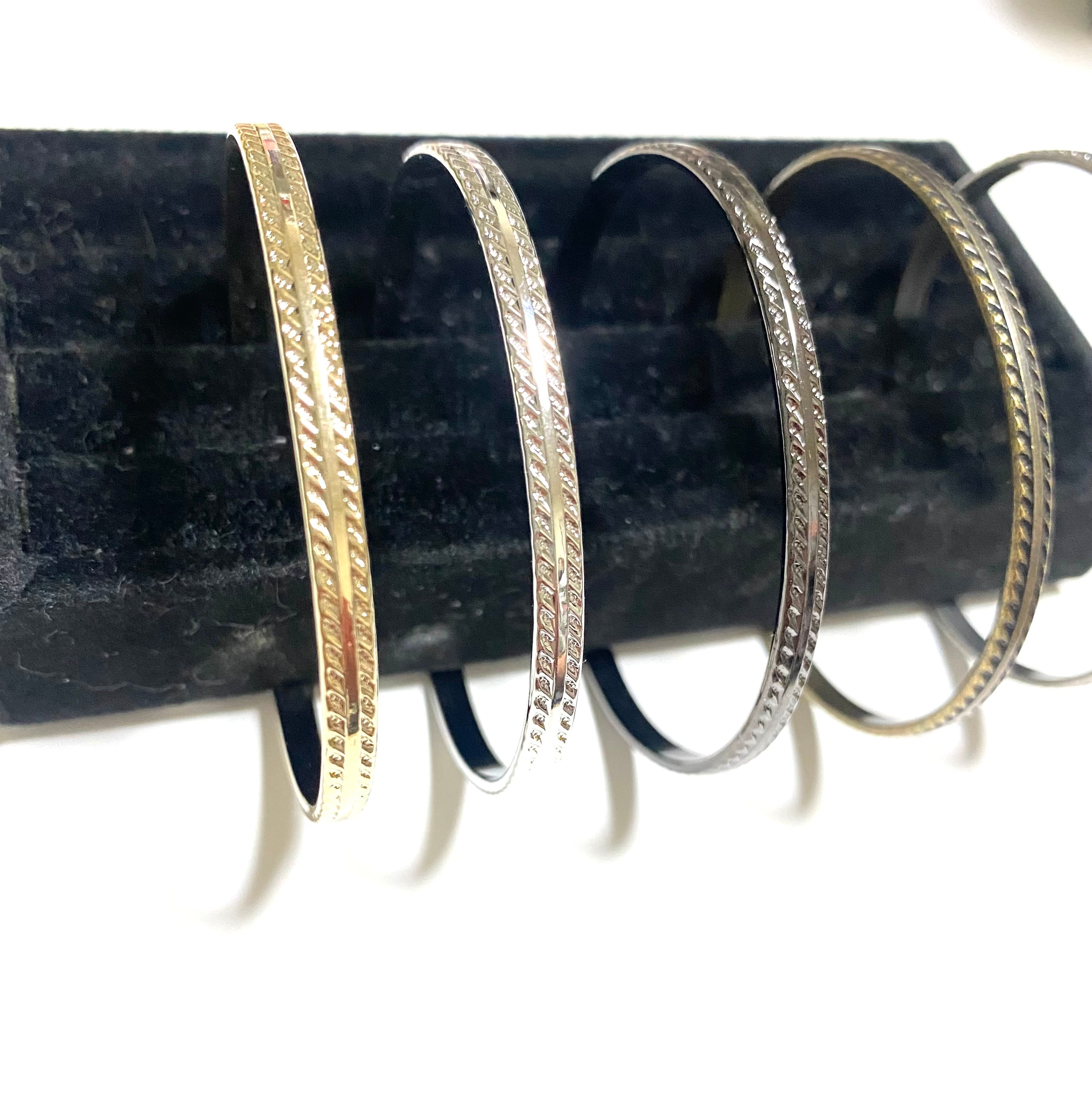 平アラベスク柄の真鍮線を曲げた普段使いや重ね付けに最適なバングルです。